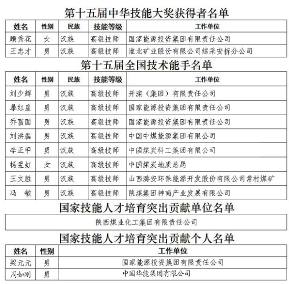 同时,陕西煤业化工集团有限责任公司和国能宁夏煤业有限责任公司枣泉煤矿梁元元、中国华能扎赉诺尔煤业公司周如刚作为对为国家技能人才培育工作作出突出贡献单位和个人给予通报表扬。