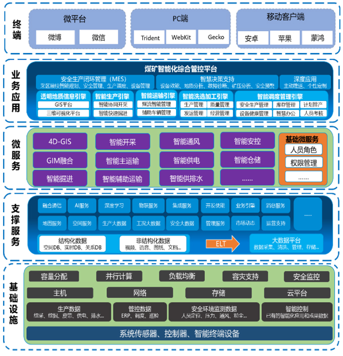 (2) 基于微服务架构设计思想,开发应用统一技术架构的智能化煤矿综合管控平台,实现各业务系统的监测实时化、控制自动化、管理信息化、业务流转自动化、知识模型化、决策智能化的目标,实现煤矿井下各系统的数据融合共享与统一协调管控。