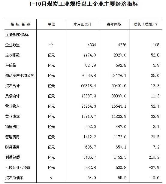 指标显示,1-10月份,4334家规模以上煤炭企业营业收入25254.3亿元,同比增长52.7%;营业成本15710.7亿元,同比增长32.9%;应收账款4474.9亿元,同比增长52.8%;利润总额5435.7亿元,同比增长210.2%。