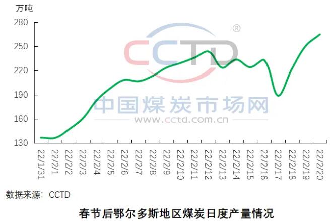 产地煤炭供应稳步增加。近期,产地煤矿复工复产进程加快,在产煤矿产量逐步增加,根据CCTD中国煤炭市场网监测的数据显示,截至目前,鄂尔多斯地区在产煤矿数量已提升至225座,较春节期间增加42座,区域内煤炭日产量已超过260万吨/日,较春节期间最低点增长超90%。