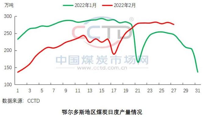 3月产地煤炭供应整体将保持在较高水平。3月上、中旬,全国两会、冬残奥会将如期召开,届时,国家及地方对于保安全、护稳定的要求会更高,产地煤矿环保、安监或将保持高压态势,国内煤炭供应将阶段性收紧。3月下旬,重要会议结束后,主产地煤矿生产活动将逐步回归常态化,全国煤炭供应将快速恢复并稳定在较高水平(日产量1200万吨以上)。