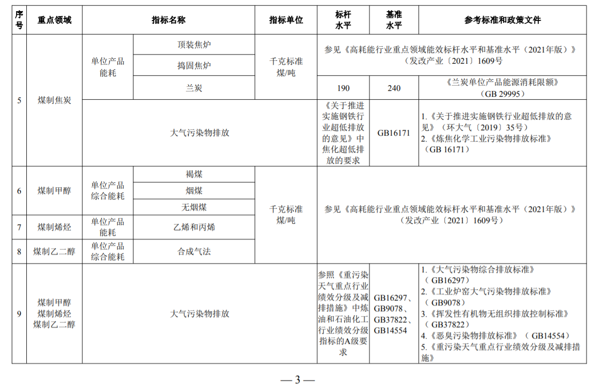 对标国内外同行业先进水平,以及国家现行政策、标准中先进能效指标值和最严格污染物排放要求,确定煤炭清洁高效利用重点领域标杆水平。坚持绿色低碳发展理念,统筹考虑实现碳达峰目标要求、促进煤炭消费转型升级、便于企业操作实施等因素,参考国家现行标准中的准入值或限定值,以及国家政策文件明确的相关指标,科学确定煤炭清洁高效利用重点领域基准水平。本文件将视行业发展和标准制修订情况进行补充完善和动态调整,适时建立包括能耗、物耗、水耗、污染物和温室气体排放水平等在内的煤炭清洁高效利用综合评价指标体系。