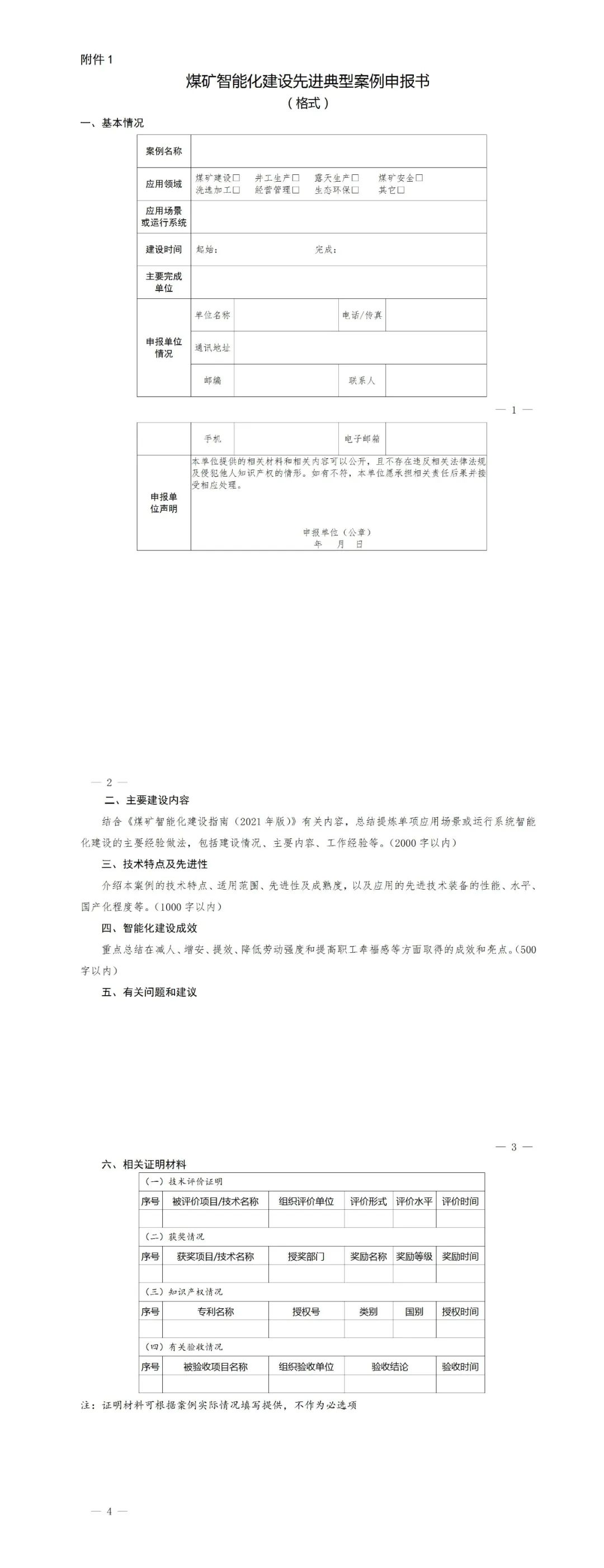 (一)自主申报。各申报主体应按要求填写《煤矿智能化建设先进典型案例申报书》(格式见附件1),地方企业将有关材料报所在地省级煤炭行业主管部门,中央企业所属单位报至集团公司总部。