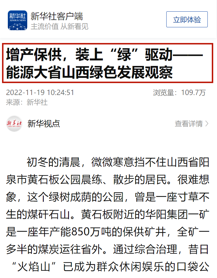 11月19日,新华社客户端以《增产保供,装上“绿”驱动——能源大省山西绿色发展观察》为题,对山西加快绿色低碳技术攻关,持续推动能源产业结构优化升级,着力提升增产保供的“含绿量”的工作进行了报道,文中重点报道了山西焦煤所属的西山煤电屯兰矿和古交电厂合作推进的绿色充填开采技术。