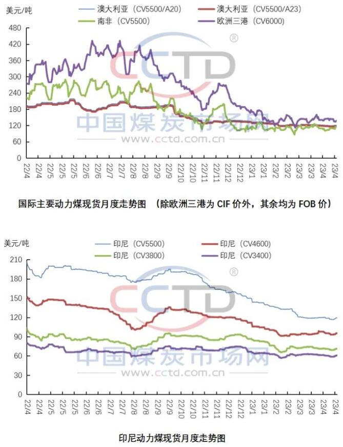 4月份,国际动力煤市场供需两端均偏弱,煤价以降为主。