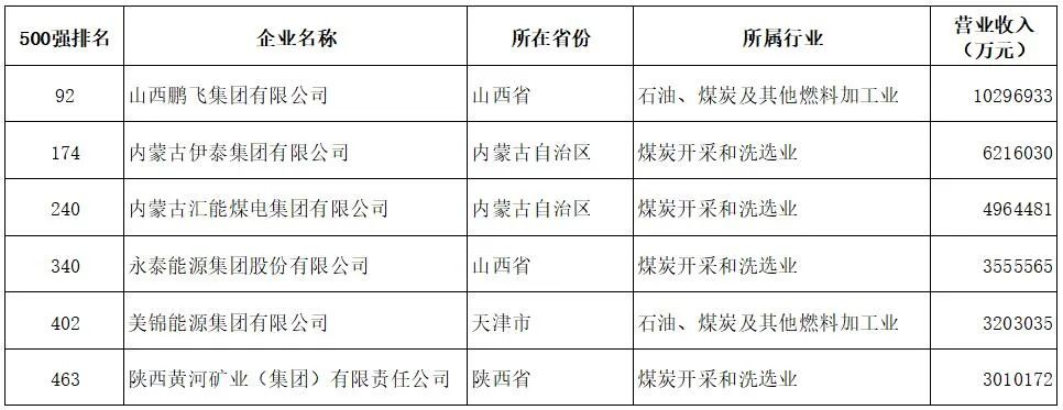 6家煤炭企业入围2023中国民营企业500强发布时间:2023-09-13 来源:全国工商联 访问量:次