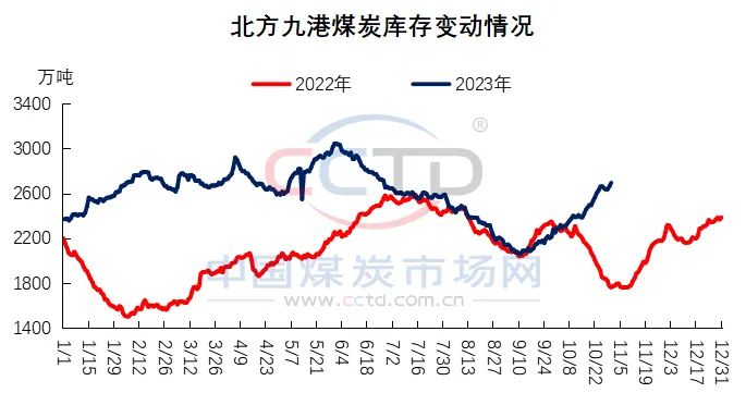 港口方面来看,近期,大秦线日发运量在128万吨左右,北港煤炭调入量小幅回升,调出量则有所减少,受以上因素影响,港口库存呈上行态势,截至目前,北方九港库存已接近2700万吨。