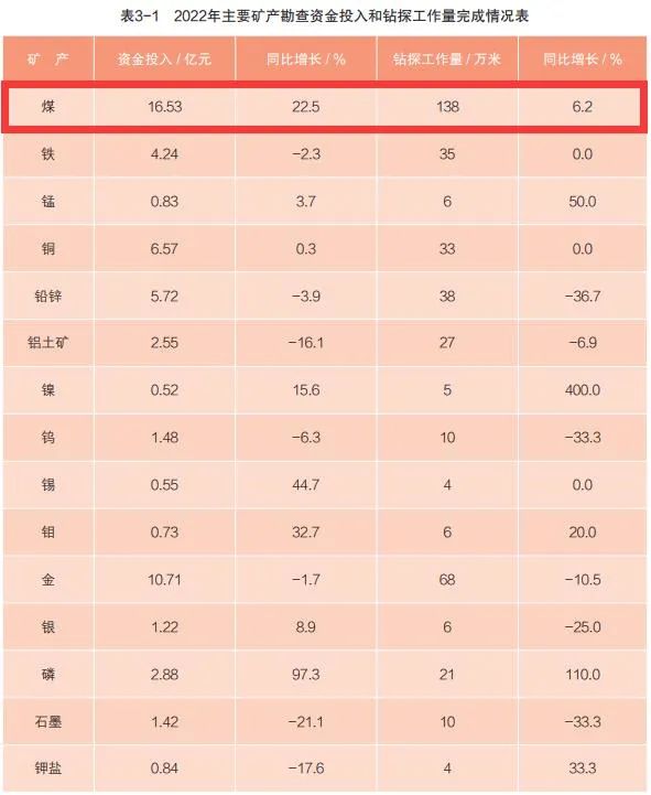 非油气矿产勘查中以煤(16.53亿元)、铀(11.74亿元)、金(10.71亿元)、铜(6.57亿元)、铅锌(5.72亿元)为主,占矿产勘查总投入的 51.8%。与2021年相比,投入增加的矿产主要有磷、锡、钼、煤等。2022年煤炭地质勘查投入16.53亿元;同比增长22.5%;钻探工作量 138万米;同比增长6.2%。