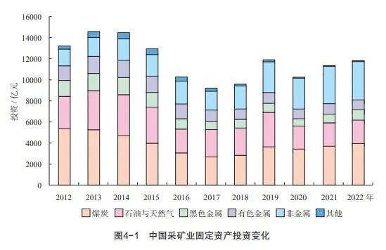 《报告》指出,2022年,采矿业固定资产投资比上年增长4.5%,比全国固定资产投资增速低0.6个百分点。在采矿业固定资产投资中,受能源和重要民生商品保供政策支持,煤炭开采和洗选业、黑色金属矿采选业固定资产投资大幅增长,分别增长 24.4%和33.3%;石油与天然气开采业、有色金属矿和非金属矿采选业固定资产投资增速分别为15.5%、8.4%和17.3%。