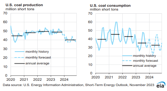 报告显示,随着天然气和可再生能源越来越多地取代燃煤电厂,2024年,美国煤炭产量预计将进一步下降至4.804亿短吨,创1963年以来最低水平。
