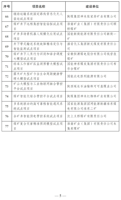 为深入贯彻落实党中央和国务院关于优化提升传统产业的决策部署,加快煤矿智能化关键技术攻关和推广应用,迭代提升煤矿智能化建设运行水平,根据《国家能源局综合司关于开展煤矿智能化技术升级应用试点工作的通知》(国能综通煤炭〔2025〕120号),经组织申报、初审推荐、专家评审和网上公示等程序,确定“煤巷钻锚铺一体化智能快速掘进试点项目”等77个项目为煤矿智能化技术升级应用试点项目。现将试点项目名单予以公布,并就有关事项通知如下。